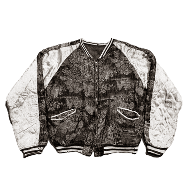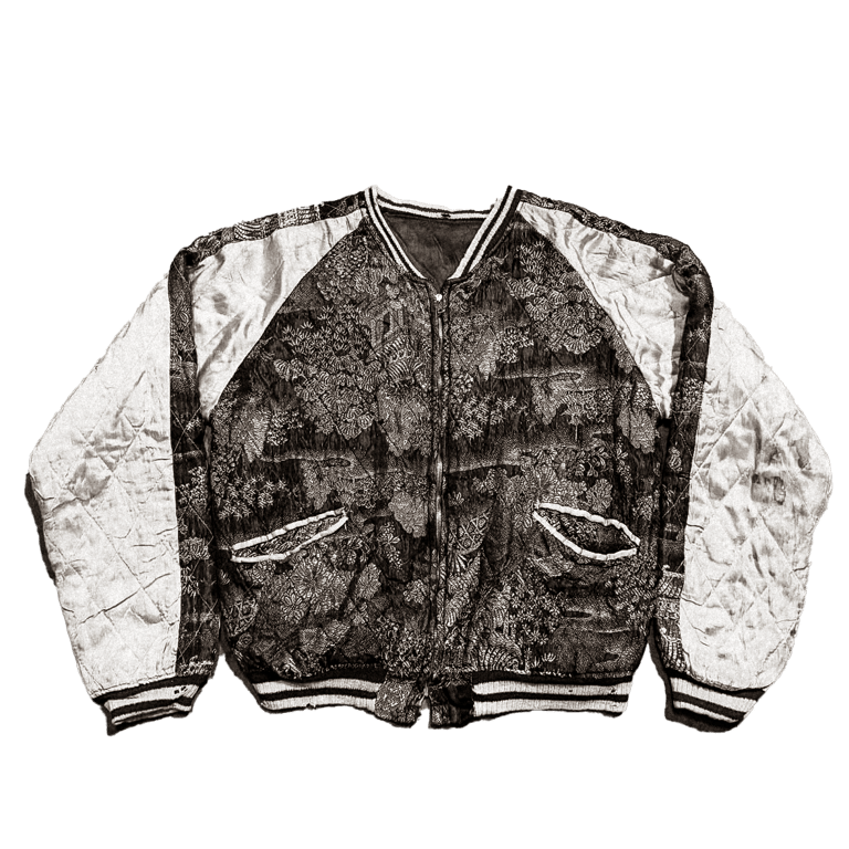le Nishijin-ori est considéré comme l’un des tissages les plus raffinés du Japon, transmis de génération en génération, alliant technique, esthétique et mémoire. Bien que les Souvenir Jackets soient majoritairement fabriquées en satin de rayonne, certaines pièces rarissimes arborent ce motif