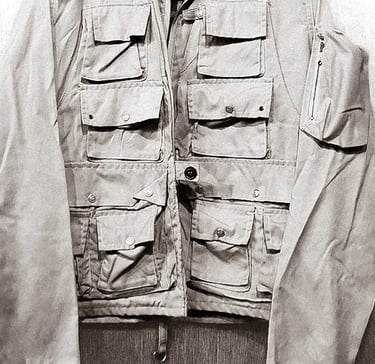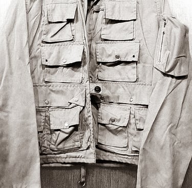 The jackets were characterized by numerous pockets, each designed for a specific use. Upper pockets were often used for flies, with compartments secured by buttons or zippers to prevent small items from falling out.